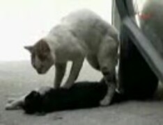 死んだ仲間のネコをマッサージするネコ