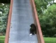 滑り台から滑り落ちる子猫さんを助ける親猫さん