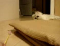 座布団沿いに猫じゃらしを追いかける猫
