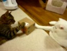 猫のおもちゃ箱が解せぬ猫とそれを冷静に見守る白猫
