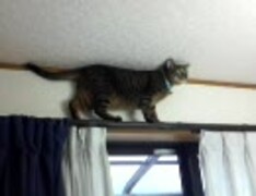 カーテンレールの上で行き止まった猫がムーンウォーク