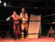 ターザン後藤選手、有刺鉄線ボード被爆!