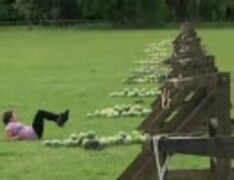 テレビ番組でスイカが女性の顔面を直撃!