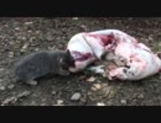 ノラ子猫が鹿皮をかじる