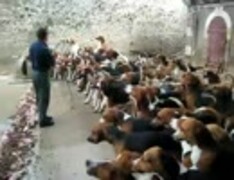 大量の猟犬へのエサやり風景。