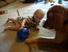 犬との風船遊びにご満悦の赤ちゃん