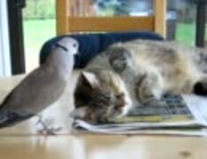猫を起こそうとする鳩、ハト
