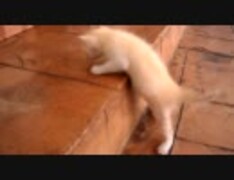 「の・・・のぼれニャいよぉ・・・」前足だけで必死に登ろうとする子猫