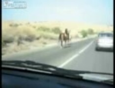 道路を走る三頭の馬・・・
