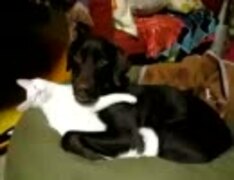 抱き合って眠る、犬と猫