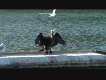 翼を広げて日光浴をするカワウ