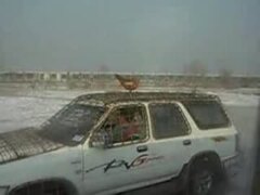 クルマの屋根のニワトリを一口で食うサファリパークのトラ