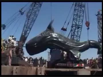 クレーンで引き揚げられた巨大鮫