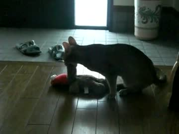 エルモと一緒にご主人様を待つネコ
