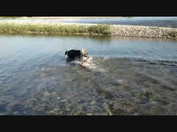 ボーダーコリーとオーストラリアンシェパードの川遊び