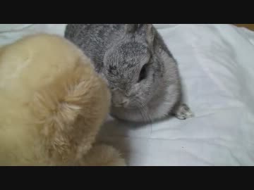 ぬいぐるみにも意外に冷静なうさぎ