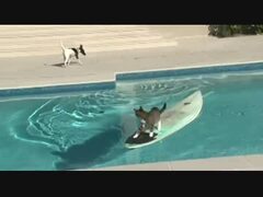 犬に追われサーフボードで脱出する猫