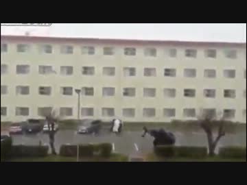 台風の暴風で飛ばされるワンボックスカー