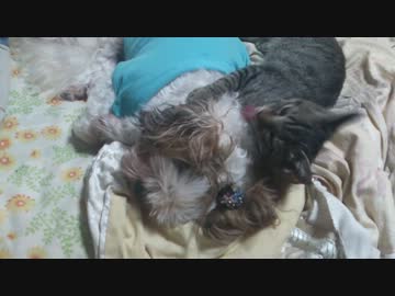 犬の毛を必死に舐める猫