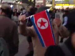 中韓朝の国旗で熱烈な応援を受ける枝野経産大臣