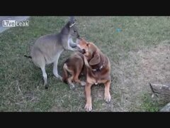 犬とキスをするカンガルー