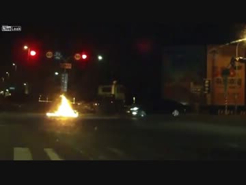【台湾】 トラックに挟まれ炎上する原付バイク 【車載動画】