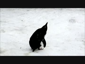 がんばって雪を食べようとする子ペンギン