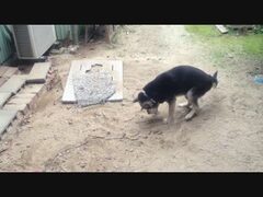隠れて庭で粗相しようとするも、飼い主に見つかって開き直る飼い犬クロ