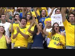 コンフェデ杯でガンバレふくしまの紙を持ったブラジルサポーター