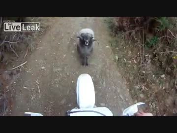 ヒツジに絡まれ逃げ惑うバイク乗り