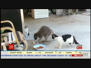 猫の餌を盗んで、とっとこ走り去るアライグマ
