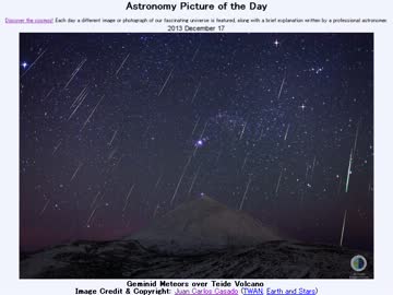 2013年 12月17日 「テイデ火山上空のふたご座流星群」-Astronomy Picture of the Day