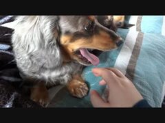 手にじゃれ付くダックス