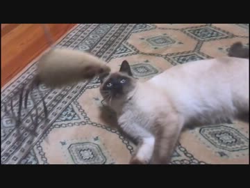 ねずみのおもちゃをモフるなり シャム猫にゃりー。