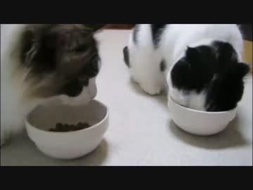 スコティッシュとラグドールのお食事風景
