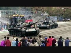 陸上自衛隊の74式戦車が唸りと砂埃を上げてぐるぐる