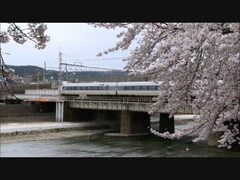 京都鴨川、桜の向こうを通過していくトワイライトエクスプレスなど