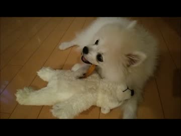 ポメラニアンがサルになる生後4ヶ月。ホッキョクグマに対して勇猛果敢な攻撃!モフモフなタレ目白ポメ猿顔期♂
