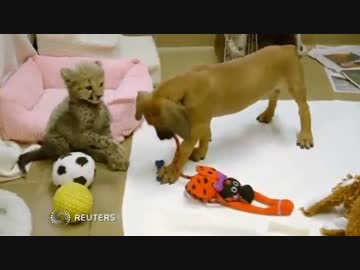 赤ちゃんチーターと子犬が遊んでいる サンディエゴ動物園