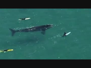 Surfers swim with whale