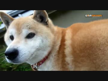柴犬 灯篭の上のごんべぇ 結果的になつにおやつをとられる