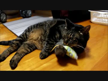 またたび入りミニミニキッカー試作品を試す猫堂店長ちゃあ