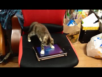 生後二ヶ月の子猫、ゲームに夢中で椅子から落ちる。