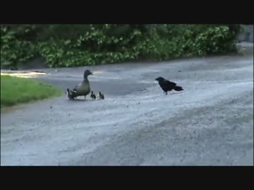 ママダックが子ダックをカラスから守り抜く