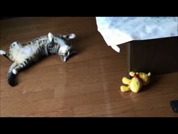 にゃーにゃー言いながらプーさんと遊ぶ猫