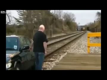 踏切で乗用車が立往生