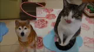 猫ミルキーのまわりを回る柴犬ひかり