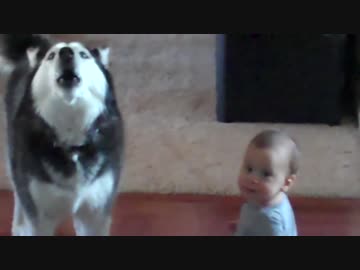 赤ちゃんの声に反応したりして気にかける優しいシベリアンハスキーの犬