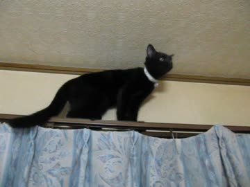 黒猫トト カーテンレールから