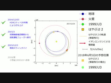 はやぶさ2の位置とイオンエンジンによる軌道変更(2014/12/3~2018/6/5)